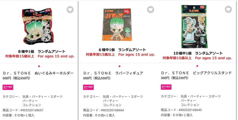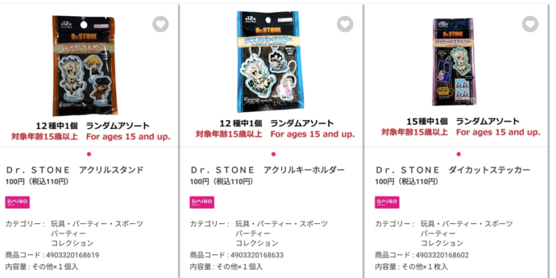 100円ショップ『Dr.STONE(ドクターストーン)』各商品の JANコード