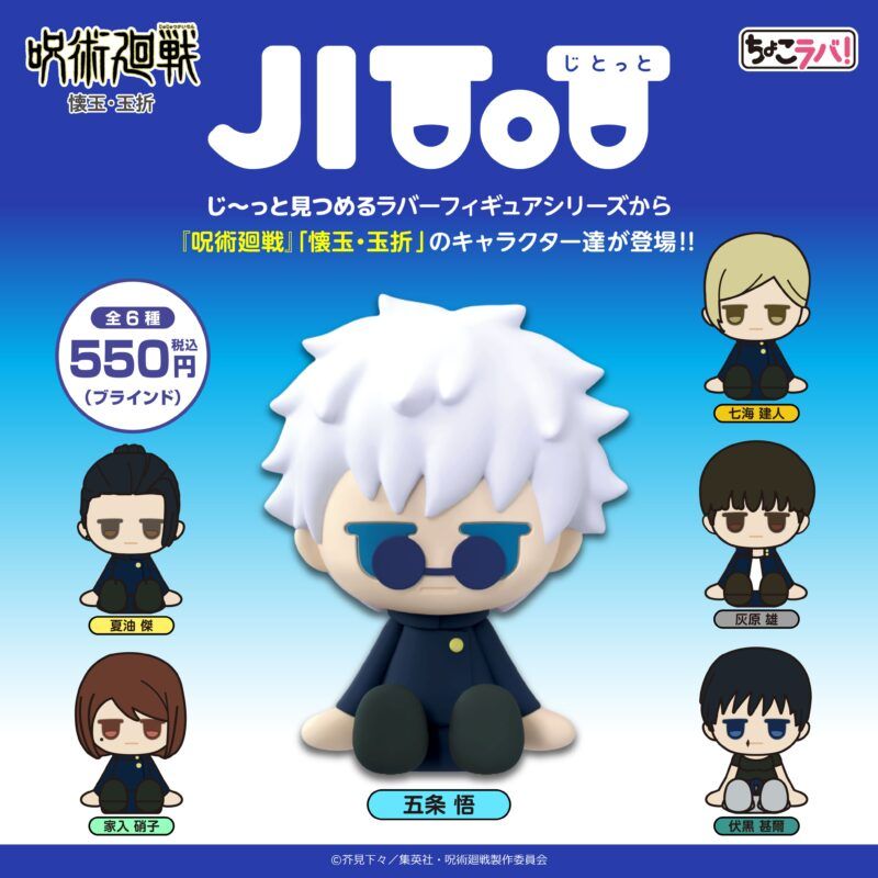 『 呪術廻戦 』「懐玉・玉折」より、JITOT フィギュアが、全国の 100 円ショップにて 10月上旬より新登場!!じ~っと見つめる五条悟達がかわいいラバーフィギュアのグッズです!
