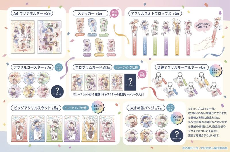 アニメ10周年をお祝いする6つ子の特別描き下ろしイラストや、おなじみの名エピソードキャラなどのメモリアルな描き起こしイラストを使用したアイテムで、トレーディンググッズがメインで登場!
