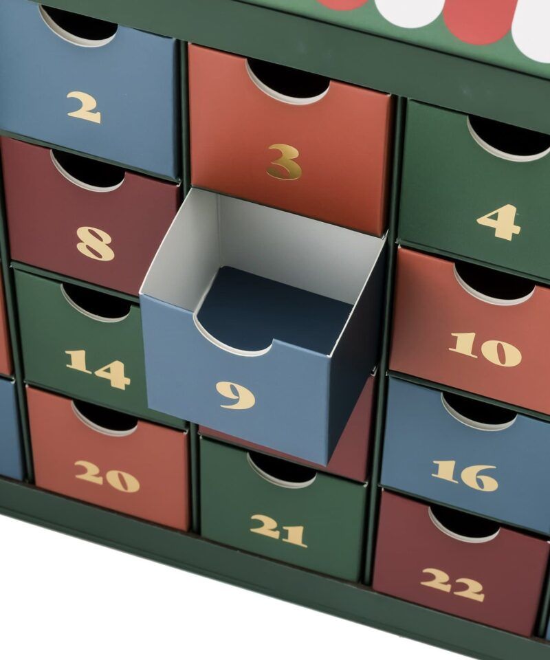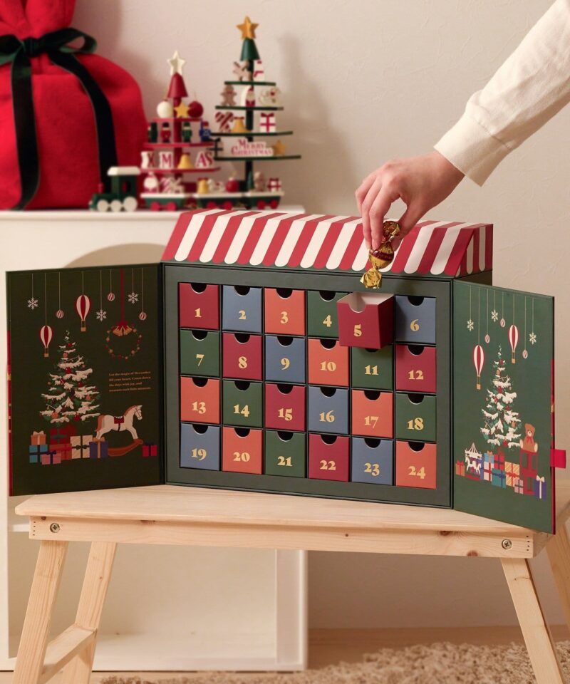 12月1日からクリスマスイブまでのカウントダウンを楽しめる、引き出し式のアドベントカレンダーです。