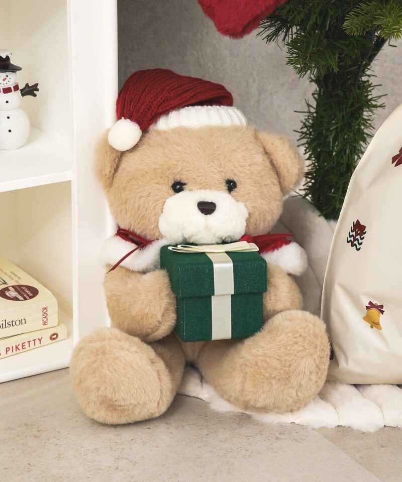 ●ふわふわの手ざわりが心地よい、サンタ帽をかぶったくまのぬいぐるみです。