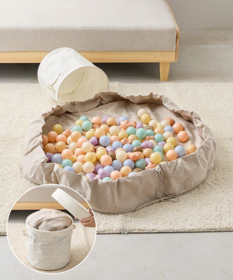 ●マットの上でおもちゃを広げて遊んで、片付ける時はそのまま紐を引っ張るとおもちゃをまとめて収納できます。