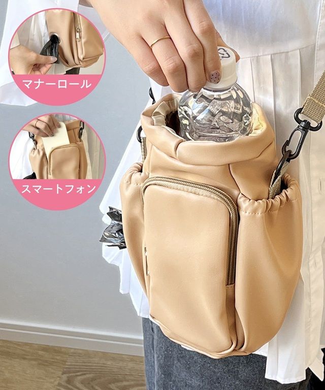 ●ウォーターボトルやマナーロール用のポケットが付いたショルダーポーチ。