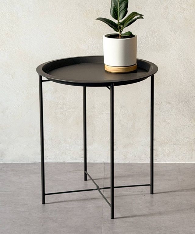 ●細身のアイアン脚に、取り外し可能な丸トレーを組み合わせたシンプルなサイドスタンド。