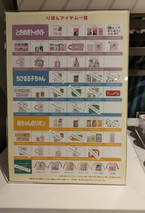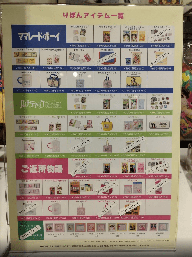 ちびまる子ちゃん、姫ちゃんのリボン、ご近所物語、ランダムグッズなどが特に売り切れが多くなっています。