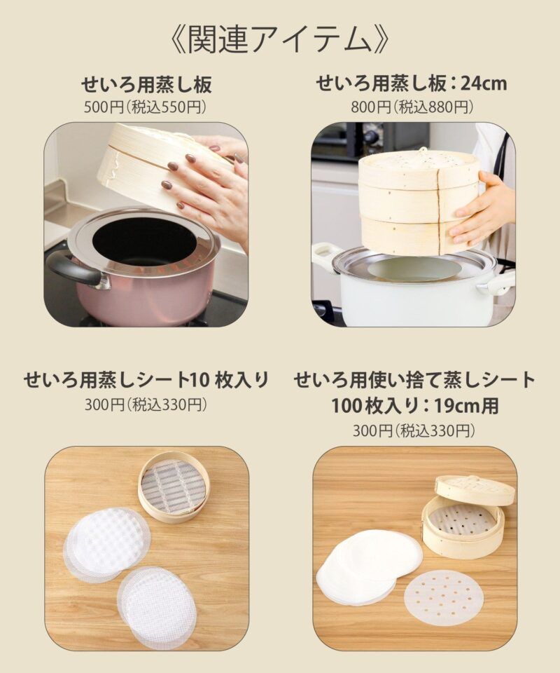 せいろ2段、せいろ用蒸し板、せいろ用使い捨て蒸しシートなどがラインナップ。