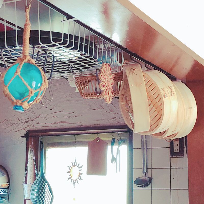 使用後に乾かす際は、S自フックを換気扇の下につけて、そこにせいろをぶら下げるという方法でメンテナンスしています。(画像のようなイメージで、換気扇の下に吊り下げています。カビないように、季節によってですが一晩くらいは置きっぱなしにしていることがい多いです。)