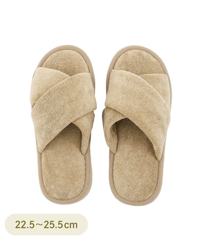 ●リブ素材とクロス結びのデザインがおしゃれなスリッパ。
