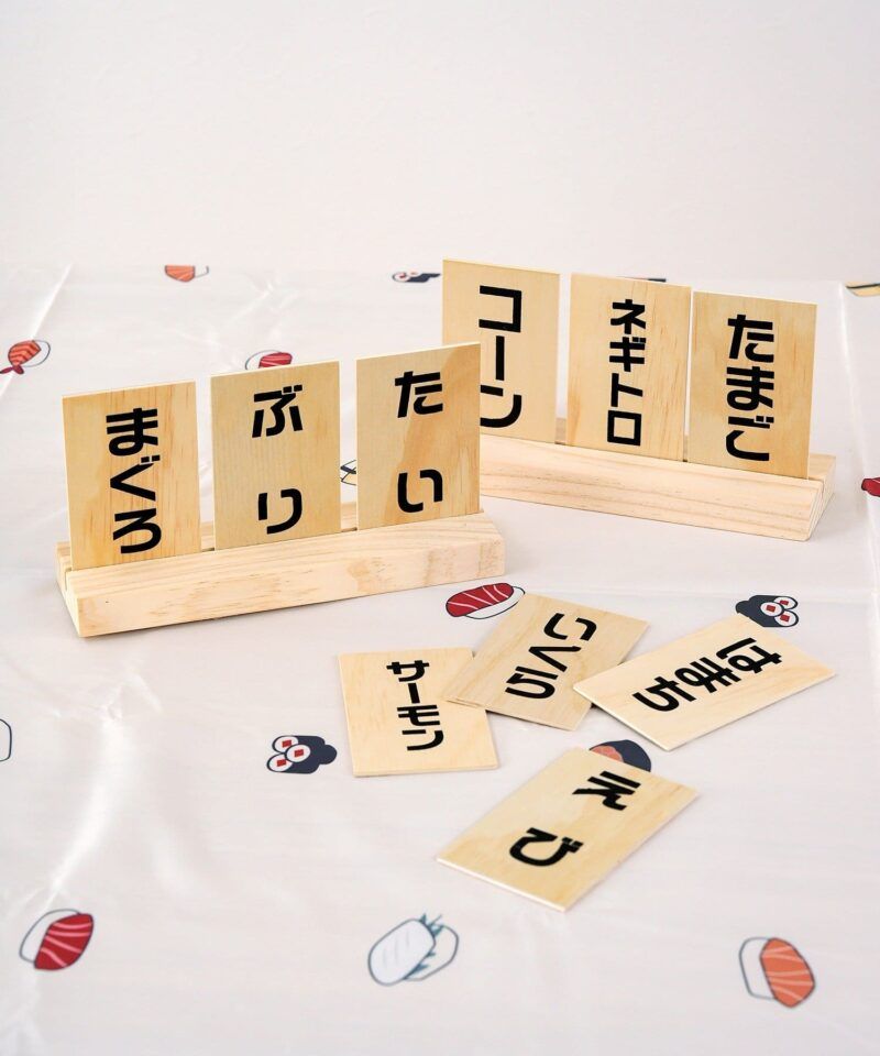 セット内容:台座×2、メニュー表板×10(まぐろ・たまご・サーモン・いくら・ネギトロ・コーン・えび・はまち・たい・ぶり)