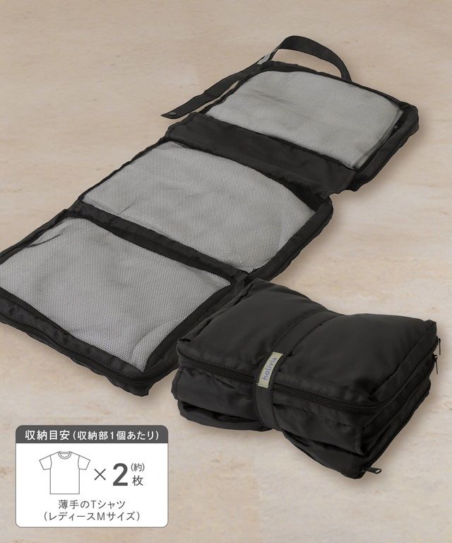 ●旅先での衣類の収納に便利な三つ折りポーチです。