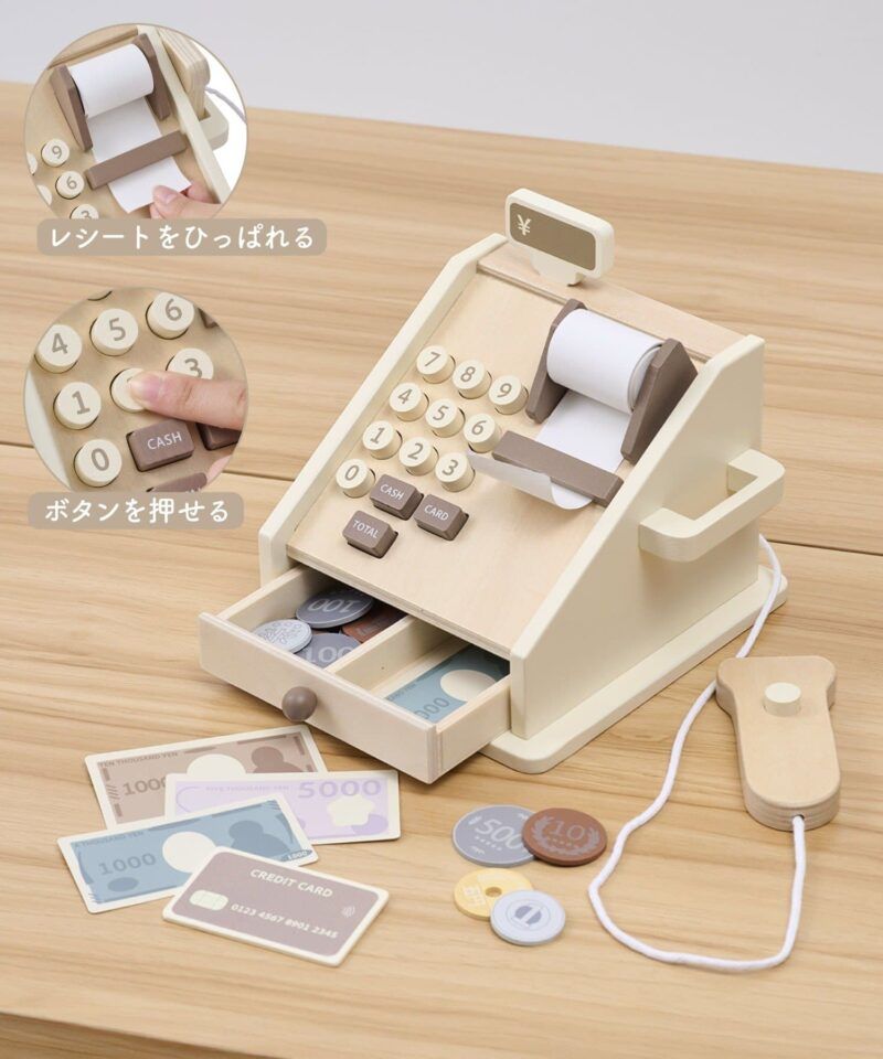 セット内容:レジ、クレジットカード、1万円札×1枚、5千円札×1枚、1千円札×5枚、500円玉×1枚、100円玉×4枚、50円玉×1枚、10円玉×4枚、5円玉×1枚、1円玉×4枚