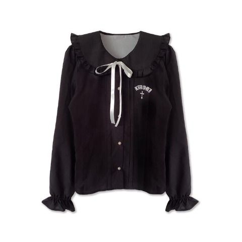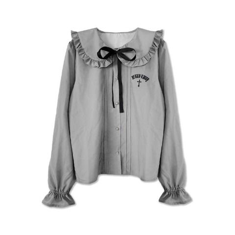 十字架プリントと特徴的な襟周りのフリルがあしらわれ、重厚感のあるゴシック感を演出。