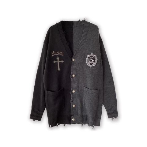 アシンメトリーなクレイジー配色とダメージ加工がポイントになったクロミのニットカーディガン。