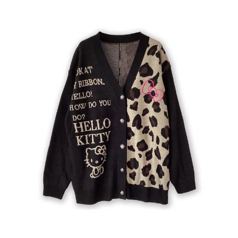 ヒョウ柄とのアシンメトリーな配色のハローキティのニットカーディガン。