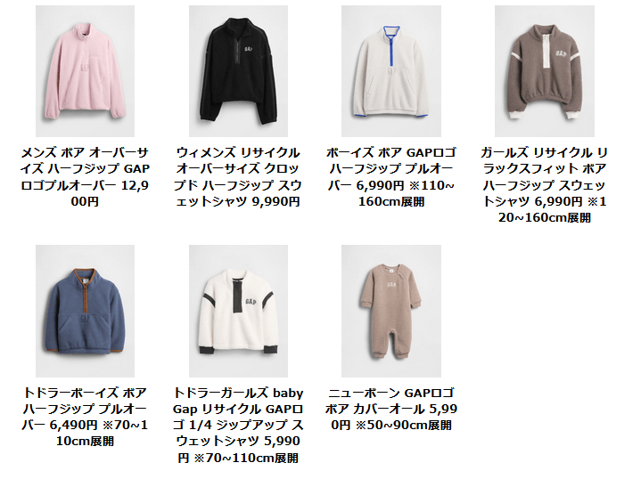 目玉商品として、ウィメンズはボア素材が心地良いスウェットトップス、Gapアーチロゴスウェット、プリマロフト素材のパファージャケットなどが登場。メンズは、GAPロゴスウェット、セーター、フード付きパファージャケットなどが並びます。キッズは、ガールズでウィメンズとのリンクコーデが可能なボアスウェットトップスやスウェットドレス、ボーイズはカラーバリエーション豊富なGAPロゴスウェット、温かくて動きやすいパファージャケットがラインナップ。ベビーは、ディズニーのロゴフーディーやボディオール、Gapのアイコンキャラクター “ブラナンベア”がプリントされたスウェットセットアップなどのアイテムが揃います。