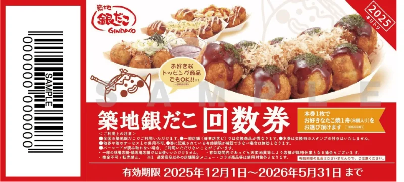 お好きなたこ焼(8個入り)と交換できる引換券が11枚入った、『ぜったいお得な回数券』 が、イオン限定の特典付きで登場します。特典として、「銀だこスタンプカード」のスタンプを2個分プレゼント!さらに、11月28日(金)の “8のつく日” はスタンプが2倍で4個分となり、最大26個のスタンプを獲得できるチャンスです!