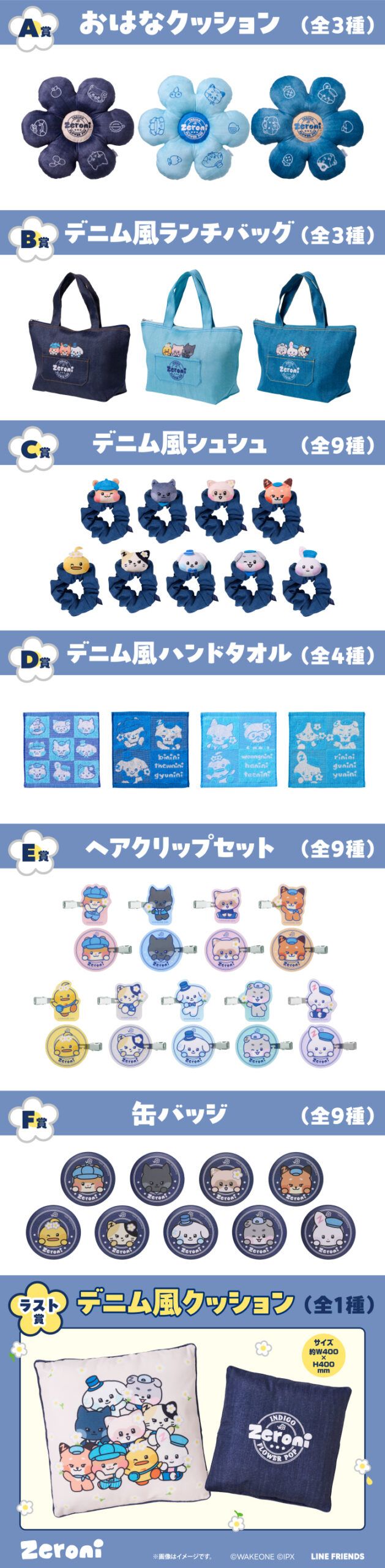 賞品は、テーマに沿った“デニム風”アイテムを中心に展開します。お花の形をしたクッションから、普段使いしやすいランチバッグやハンドタオル、マスコットのついたシュシュ、描き起こしイラストを飾ったり身に着けたりもできるヘアクリップセットや缶バッジなど、どれが当たってもハズレ無しのラインナップです。