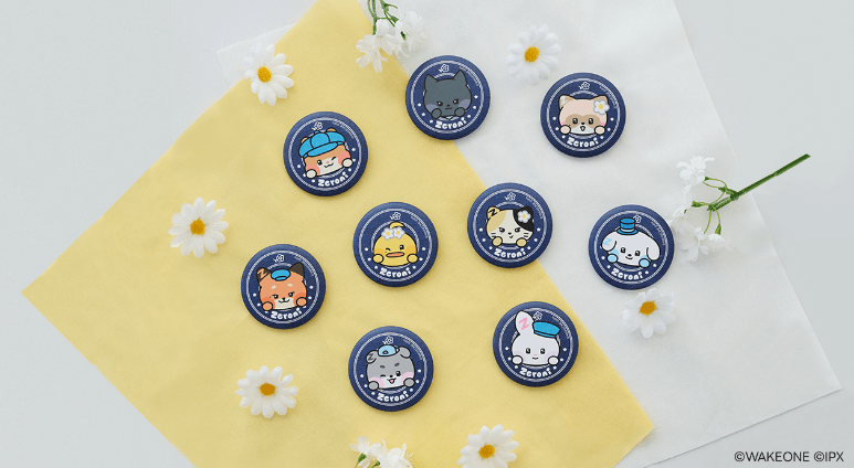 zeroniたちがひょっこりのぞく丸形缶バッジ。