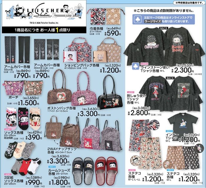 しまむら系列アベイル『ベティちゃん(ベティーブープ)』コラボの新作を、2026年4月4日(土)~販売します。Tシャツ、ステテコ、ショッピングバッグ、ポーチ、ナップサック、ソックスなどラインナップ!