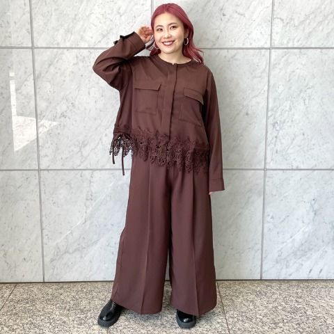 同素材のワイドパンツとのセットアップ着用もおすすめです。