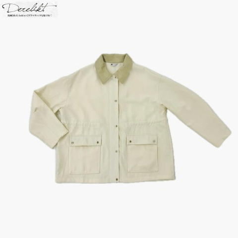 襟部分には合成皮革を使用し、異素材デザインにしています。
