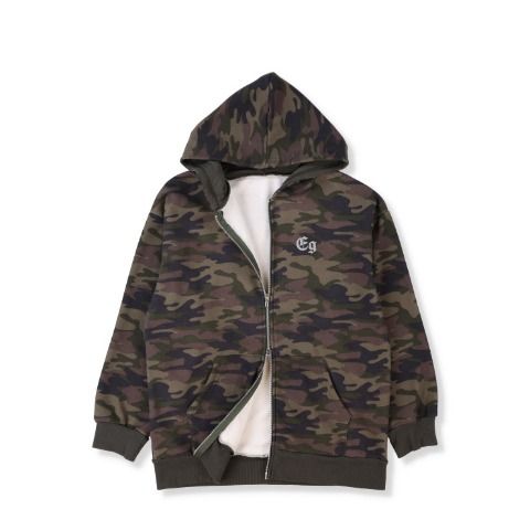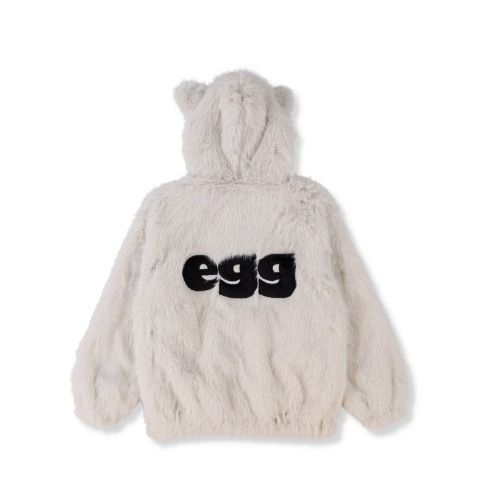 フロントはファスナーに加えて合皮ベルトをあしらい、後ろ見頃には「egg」ロゴワッペンをオン。
