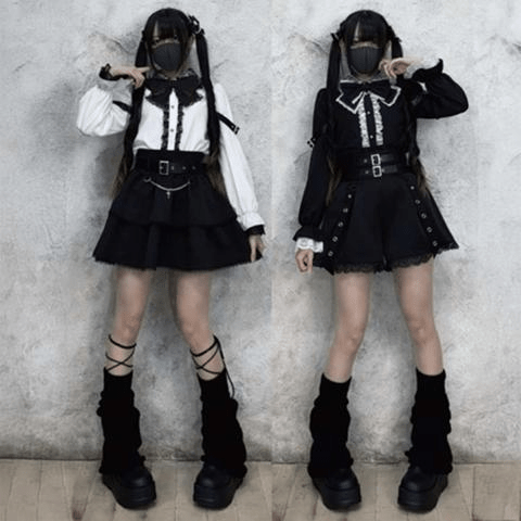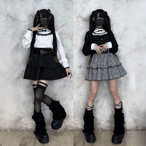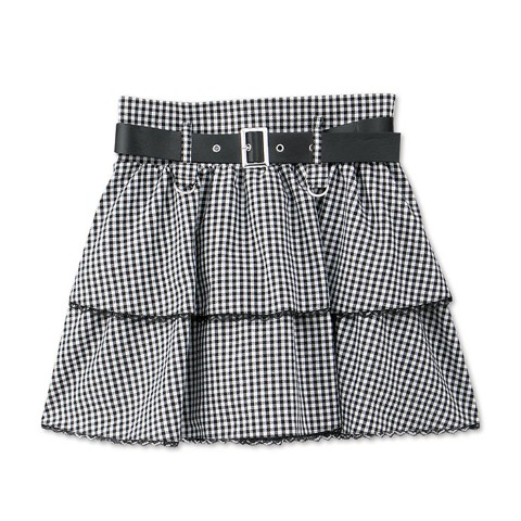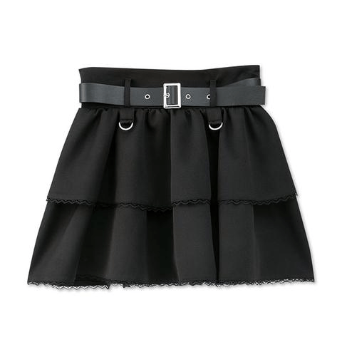 エッジの効いた合皮ベルトにふんわり広がったティアードスカートがダークかわいい印象に♪