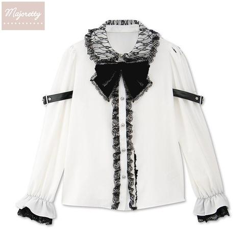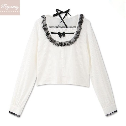 重ねたレースが華やかさをプラスした闇かわいいブラウスは胸元のリボンと丸いシルバーの釦がポイント。