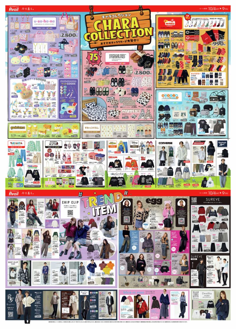アベイル チラシ速報2025年10月4日~花子くん、ゆるキャン、クレヨンしんちゃん、ホカロン、スヌーピー、ウサハナ、ぐでたま、えびふらいのしっぽ、グレムリンなど秋冬のキャラコラボが新発売!egg(エッグ)じゅな&あいみんが着るコーデも!
