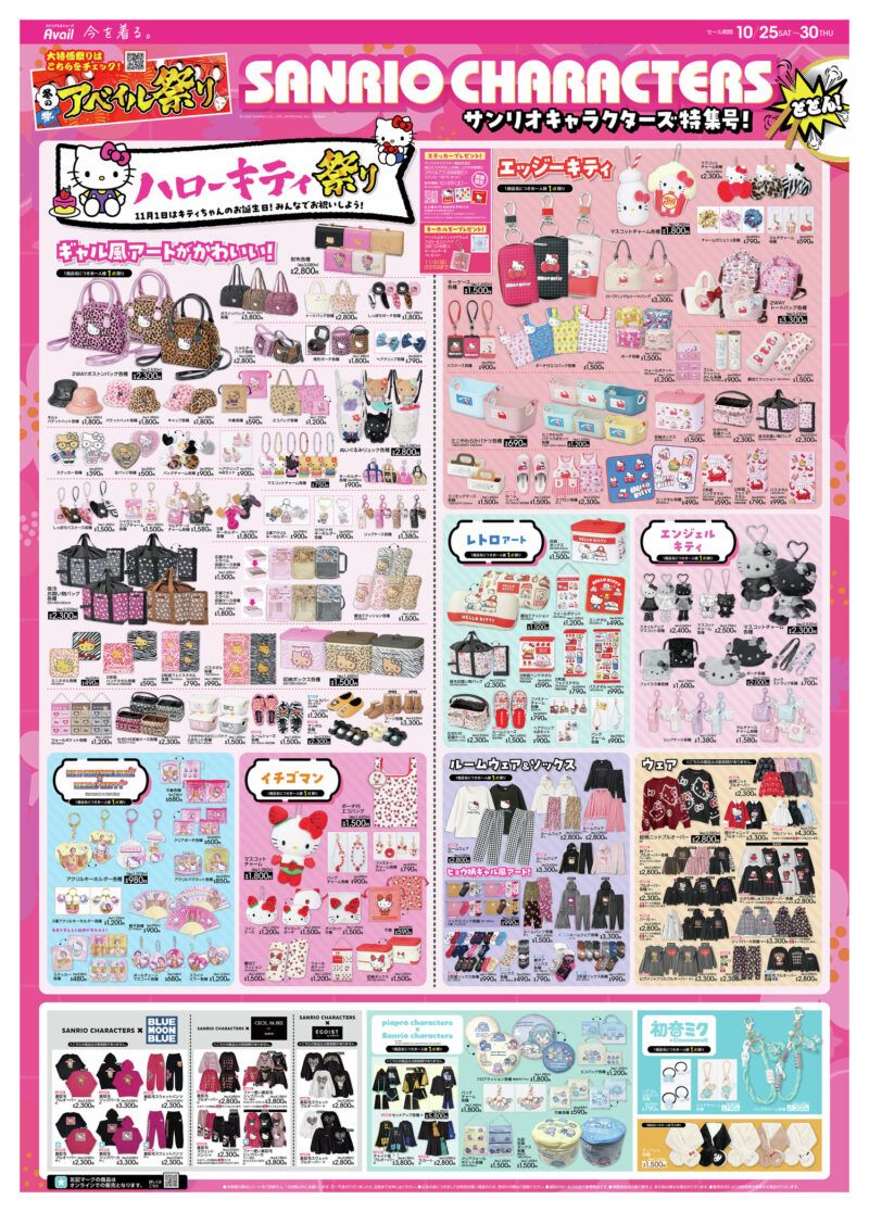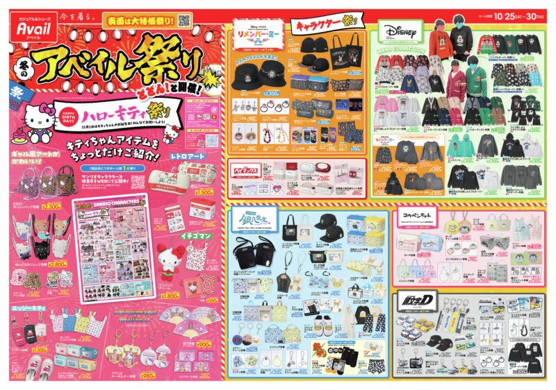アベイル チラシ速報2025年10月25日~アベイル祭りで日替わりセールも実施!ハローキティ祭りでサンリオ大型コラボ!ディズニー、コウペンちゃん、銀八先生、頭文字Dも新発売!