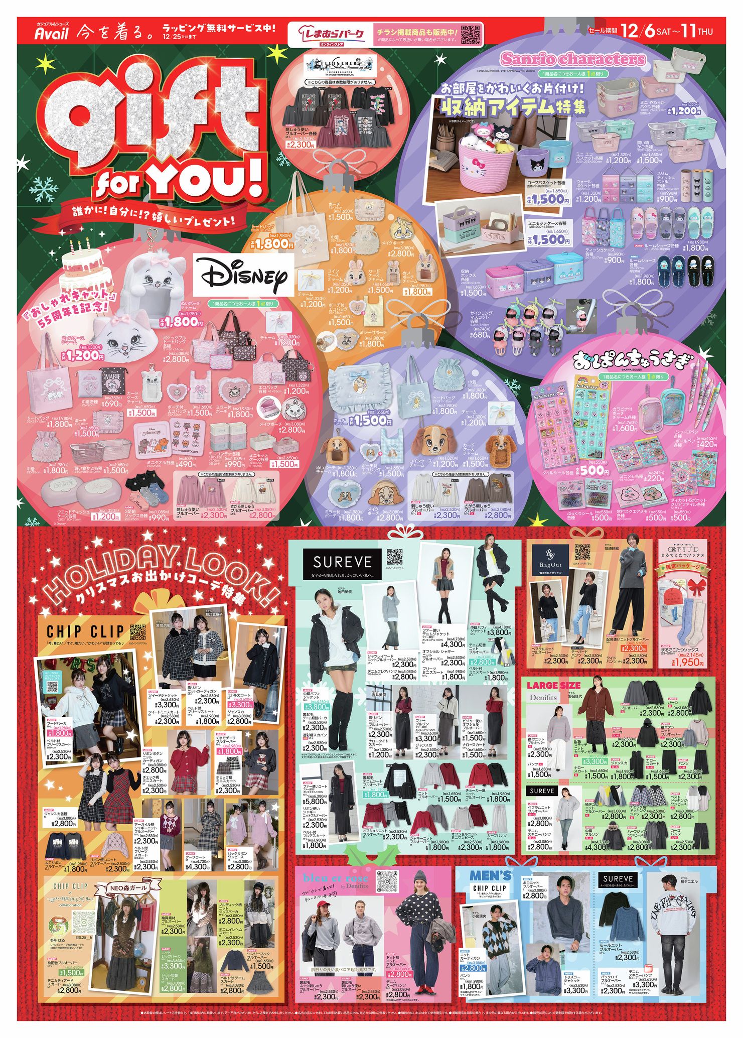 アベイル チラシ速報2025年12月6日~おぱんちゅうさぎ、ベティーブープ、ディズニー マリー、レディ、ミスバニーのグッズがギフト用にもオススメ!サンリオからはキティ、クロミ、ハンギョドンの収納アイテム!クリスマスお出かけコーデ特集も!