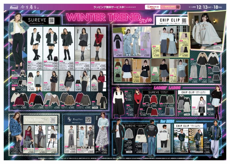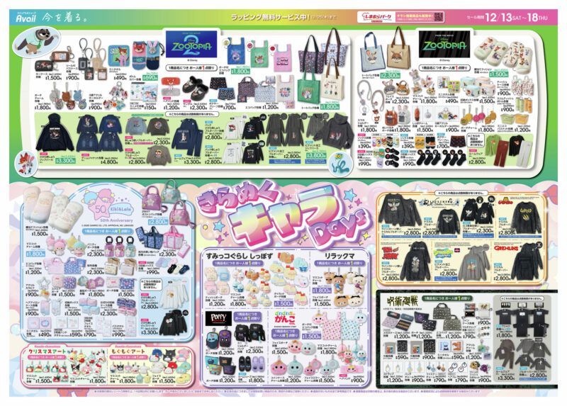 アベイル チラシ速報2025年12月13日~ズートピア大型コラボ!キキララ50周年企画、すみっコぐらし、リラックマ、ポピープレイタイム、呪術廻戦も!Vida Roseoのデザインニットも冬コーデにオススメ!