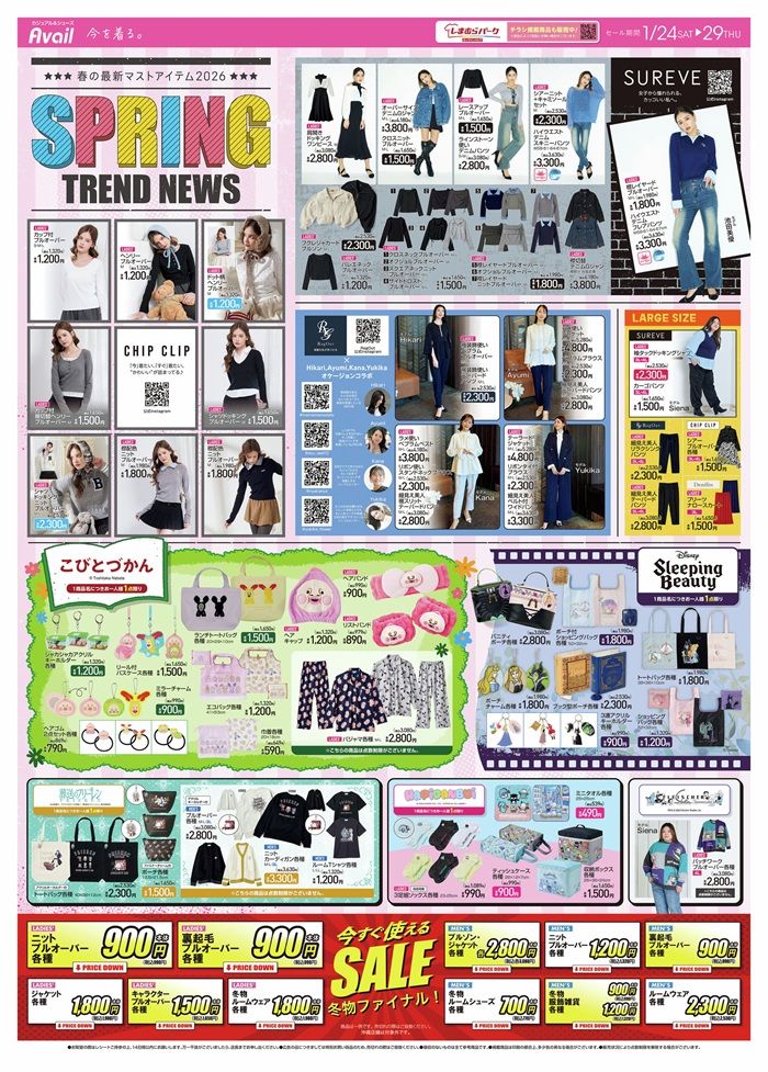 アベイル チラシ速報 2026年1月24日~春のトレンドファッションが新発売!葬送のフリーレン、眠れる森の美女、こびとづかん、はぴだんぶいコラボのグッズも!