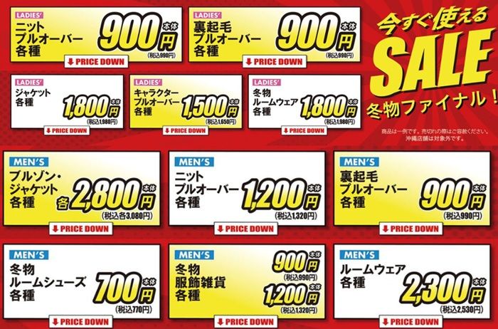 ニット、プルオーバー、ルームウェアなどの冬物がセール価格で販売!