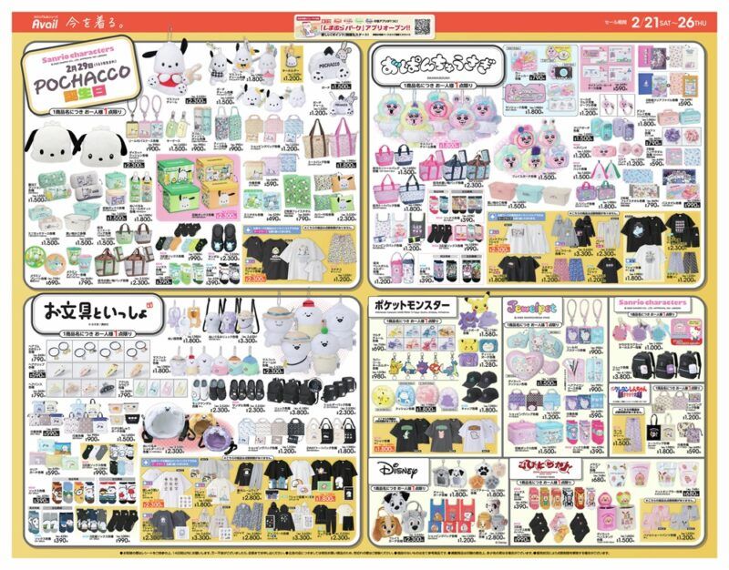 アベイル チラシ速報 2026年2月21日~ポチャッコお誕生日企画!おぱんちゅうさぎ、お文具といっしょ、ポケモン、ジュエルペット、ディズニー 犬キャラも新発売!