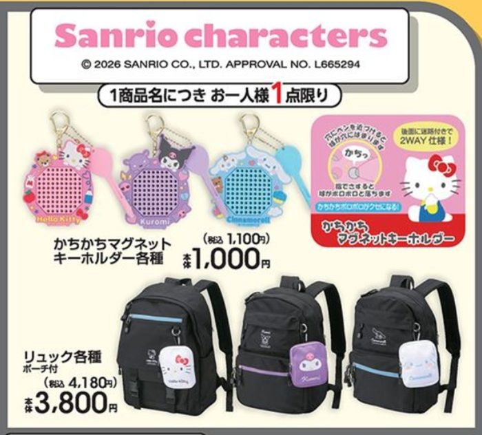 サンリオのコラボから、ハローキティ、クロミ、シナモロールなどのリュックも販売します!