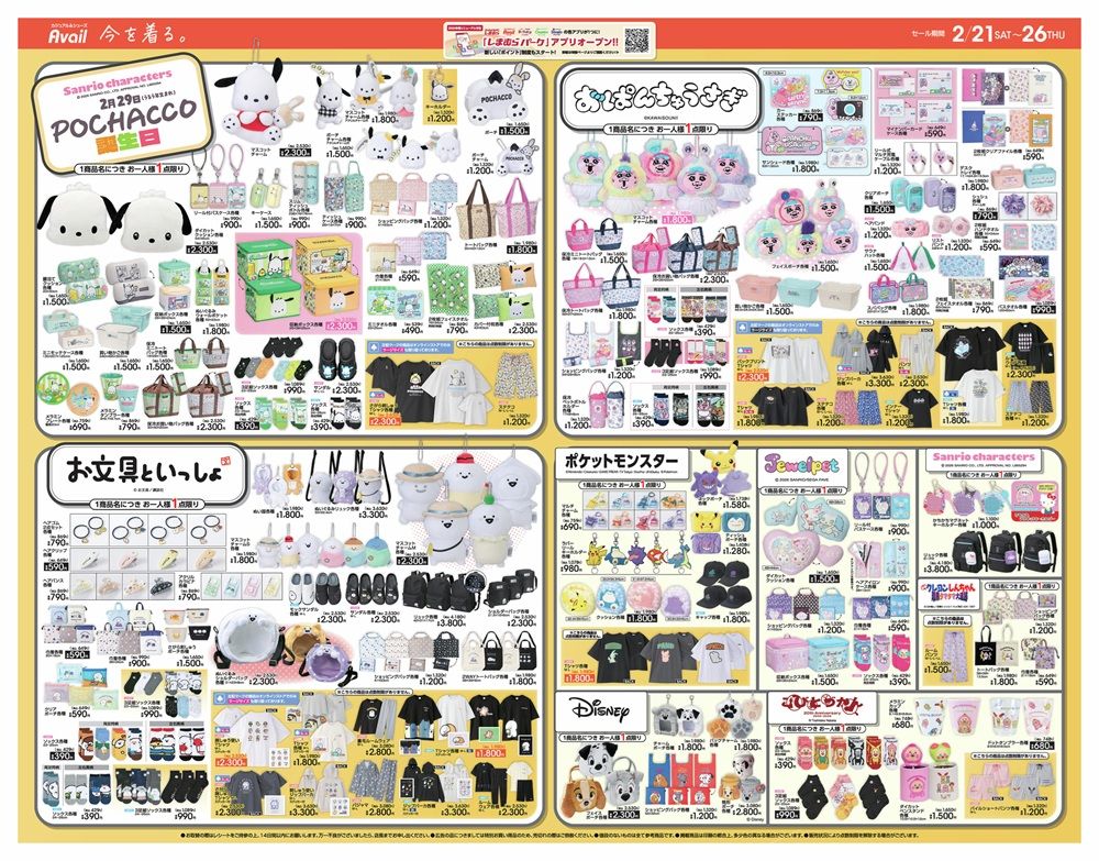 アベイル チラシ速報 2026年2月21日~ポチャッコお誕生日企画!おぱんちゅうさぎ、お文具といっしょ、ポケモン、ジュエルペット、ディズニー 犬キャラも新発売!
