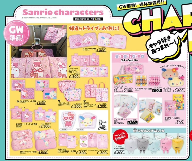 ハローキティ&ウサハナのカー用品、ウサハナのステーショナリーグッズ、歯ぐるまんすたいるのマスコットチャームがラインナップ!