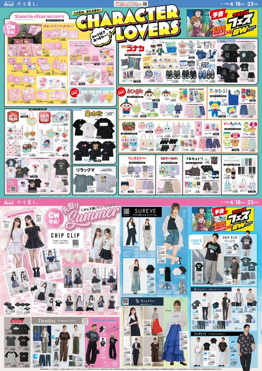 アベイル チラシ速報 2026年4月18日~名探偵コナン、シュガー・ラッシュ、モフサンドのコラボが新発売!星のカービィ、リラックマのTシャツも!NHK Eテレから、おじゃる丸、ニャンちゅう、がんこちゃん、ぐ~チョコランタン!