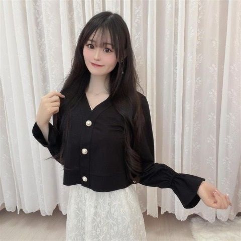 パール釦とリボンの合わせがキュートで上品な仕上がりに。