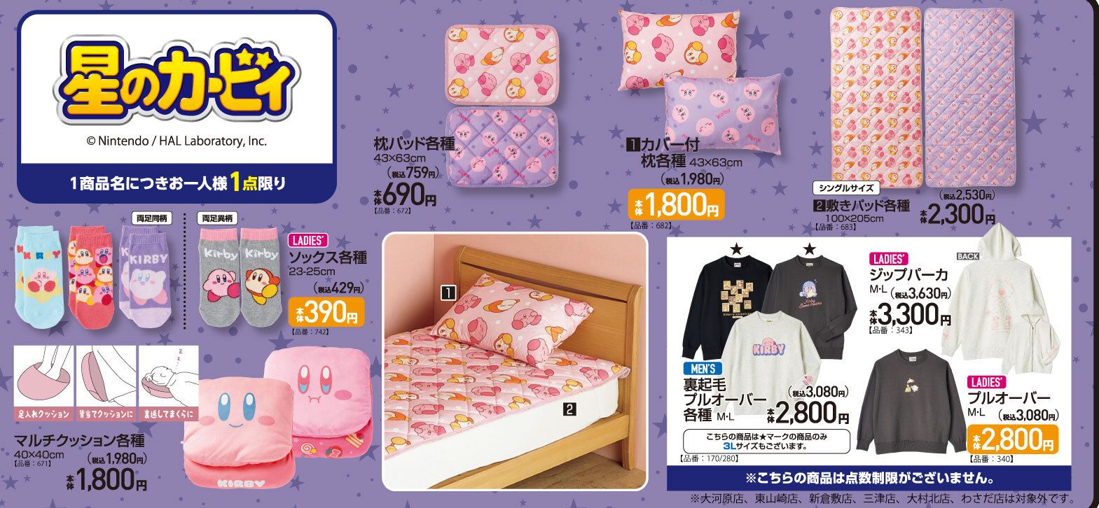 しまむら系列アベイル『星のカービィ』コラボの新作を、2025年11月8日(土)~販売します。トレーナー、パーカ、ソックス、クッション、寝具などの冬グッズがラインナップ!