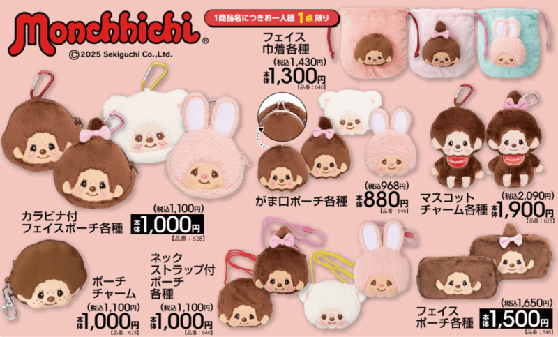 しまむら系列アベイル『モンチッチ』コラボの新作を、2025年12月20日(土)~販売します。フェイスポーチ、巾着、マスコットチャームなどがラインナップ!