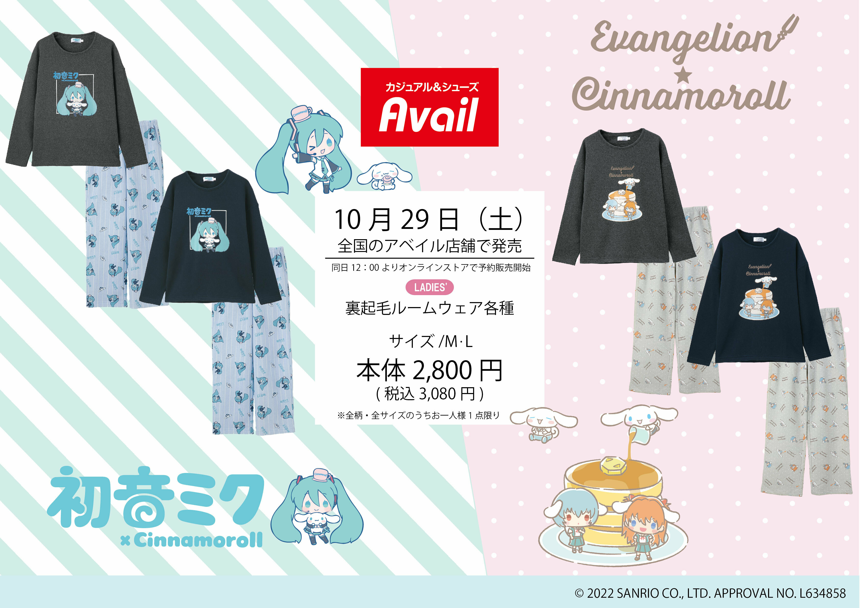 - アベイル『シナモロール』トリプルコラボ!冬のルームウェアが登場!初音ミク・エヴァ 2022年10月29日(土)