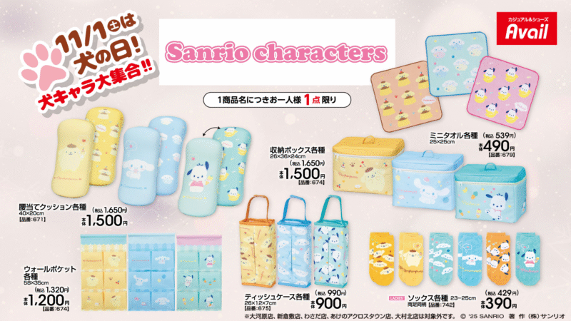 しまむら系列アベイルでは、2025年11月1日(土)~『サンリオ』コラボの新作を販売します。犬の日特集で、ポチャッコ、ポムポムプリン、シナモロールのグッズなどがラインナップ!