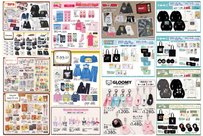 しまむら系列アベイルでは、2025年10月18日(土)~コナン、仮面ライダー、からぴち、がんこちゃん、トムとジェリー、CITY(シティ)、ニャンちゅう、かみさまキツネとサラリーマン、ンめねこ、グルーミー、リラックマ × ミスド、サンリオなどのコラボを販売します!