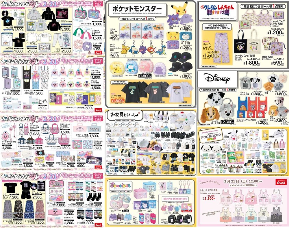 アベイルは、2026年2月21日(土)~おぱんちゅうさぎ、お文具といっしょ、ポケモン、クレヨンしんちゃん、ディズニーの犬キャラ、ポチャッコ、サンリオなどがラインナップ!