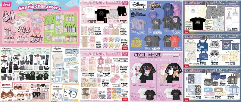 しまむら系列アベイルでは、2026年3月20(金・祝)~仮面ライダー、モンチッチ、夜は猫といっしょ、おジャ魔女どれみ、ヨッシースタンプ、お文具といっしょ、イモちゃん、サンリオなどのコラボを販売します!