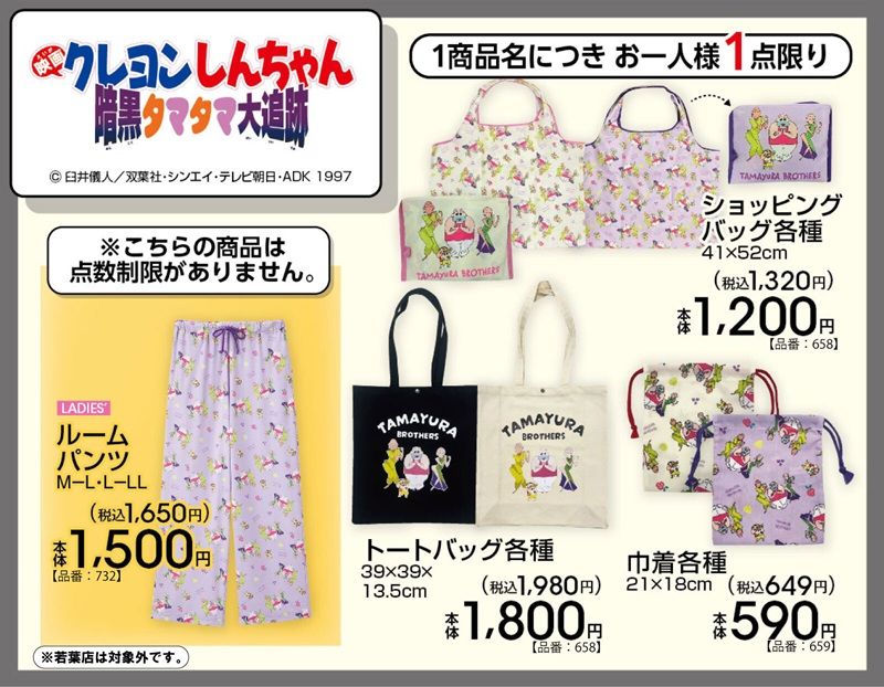 アベイル『映画クレヨンしんちゃん 暗黒タマタマ大追跡』コラボ!珠由良ブラザーズのルームパンツ、ショッピングバッグ、トートバッグ、巾着が2026/2/21より新発売!口コミ、売り切れ、入荷数、販売状況まとめ!