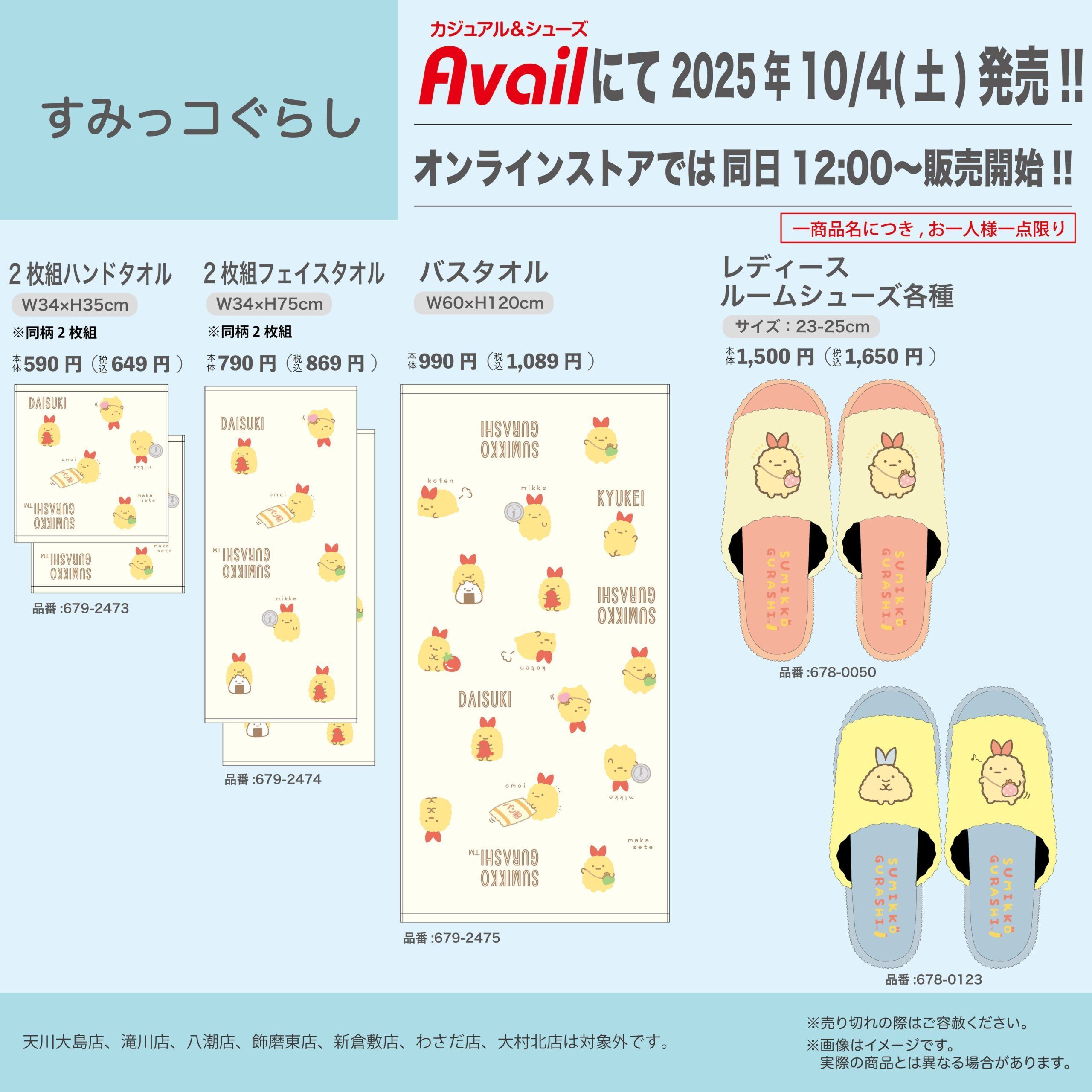 しまむら系列アベイルでは『すみっコぐらし えびふらいのしっぽ』コラボを2025年10月4日(土)~発売します。タオル、ルームシューズがラインナップ!