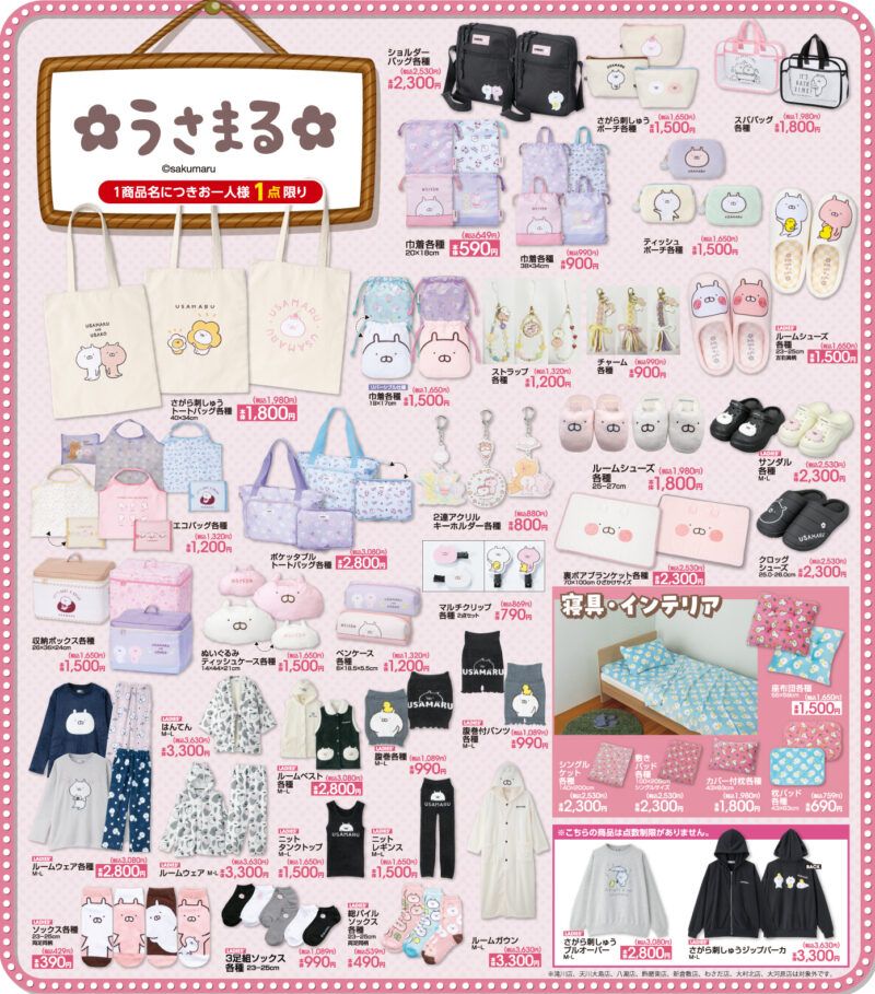 しまむら系列アベイルでは『うさまる』コラボを2025年10月11日(土)~発売します。大型コラボでバッグ、トレーナー、パーカ、ルームシューズ、寝具、インテリア、雑貨類もラインナップ!秋冬のアイテムも多く販売します!